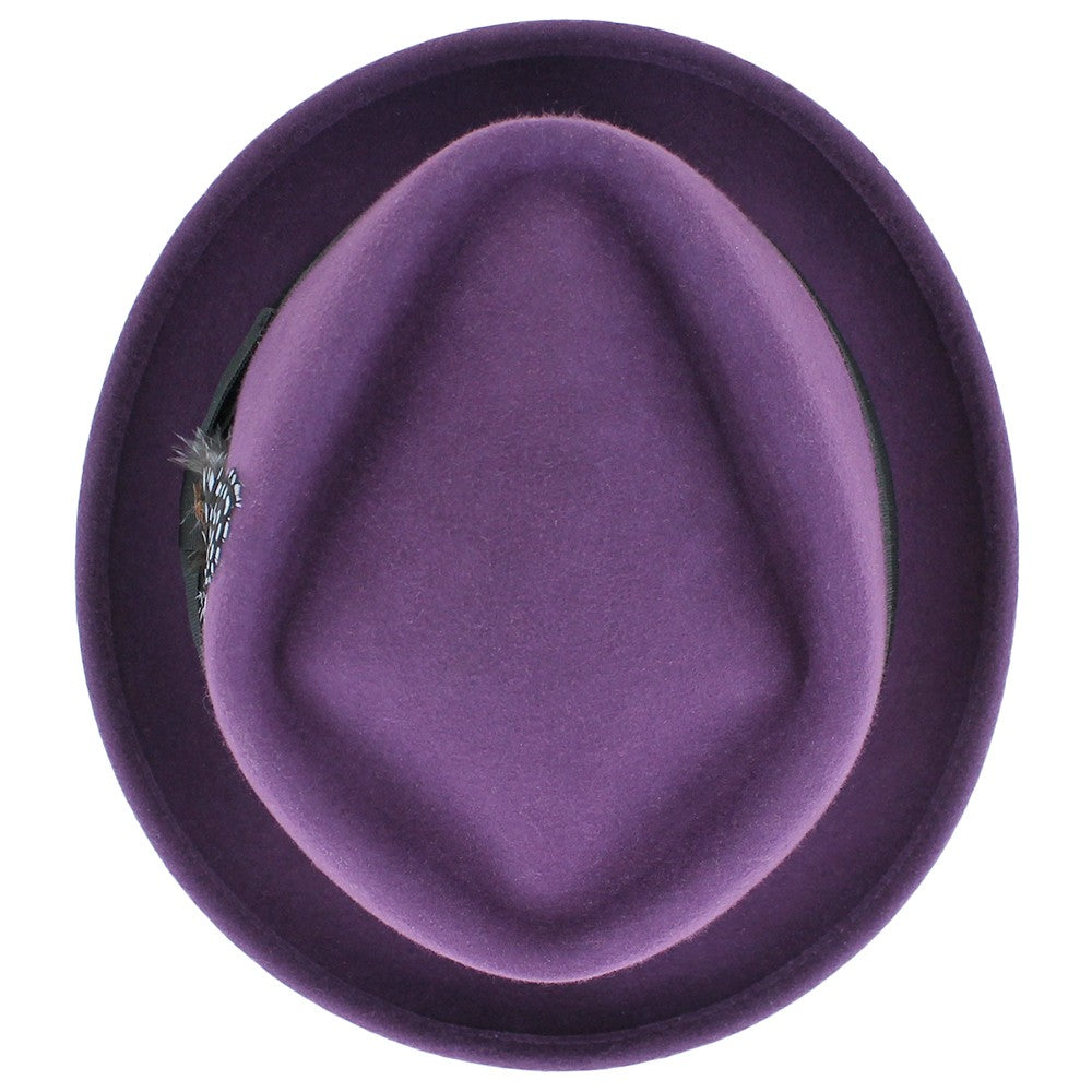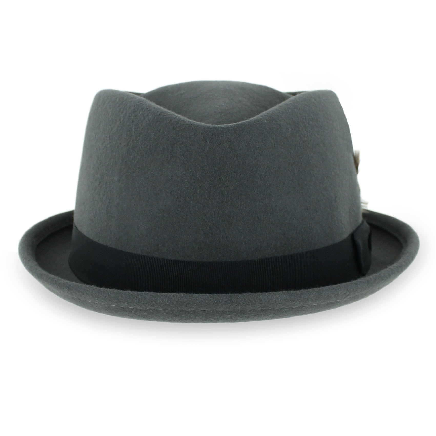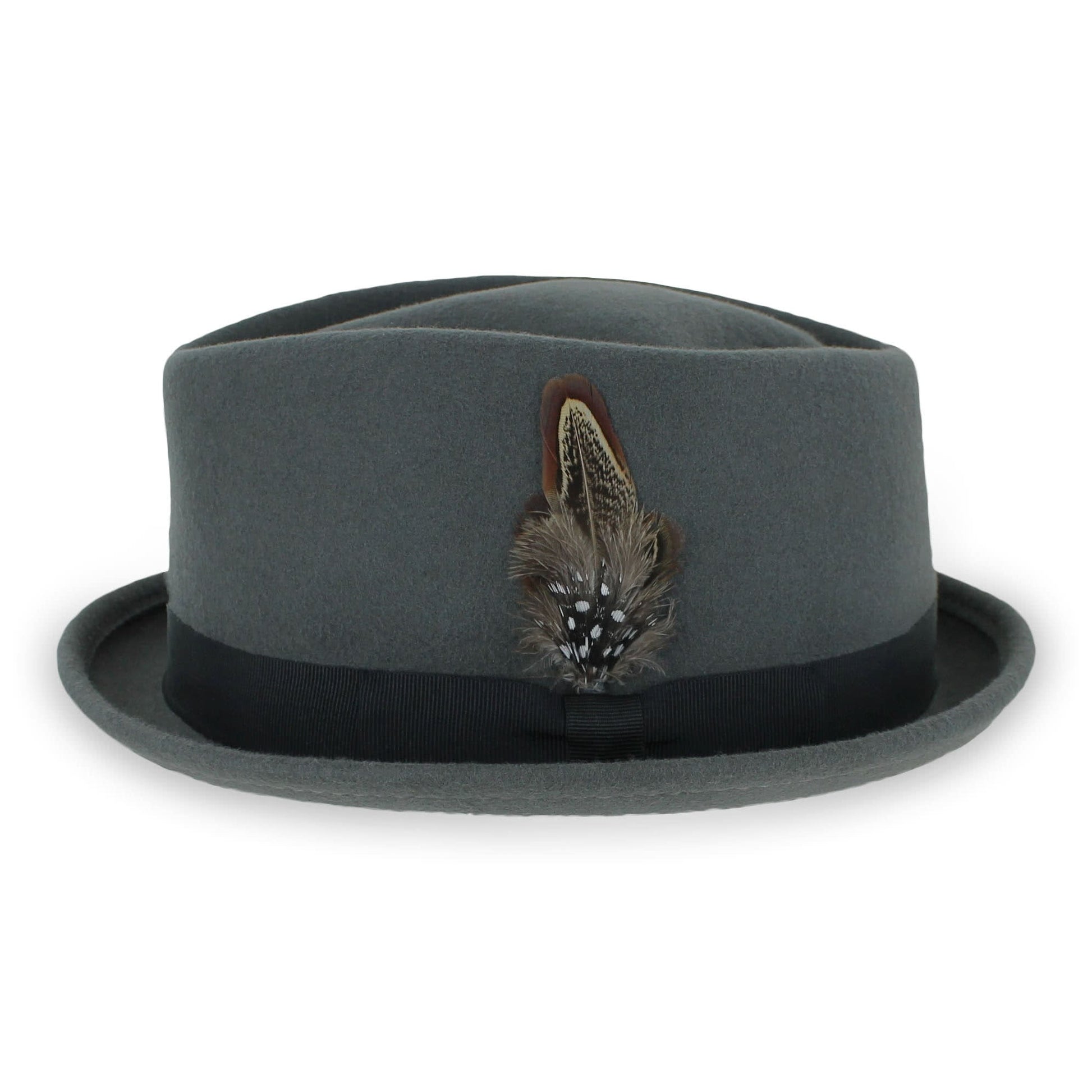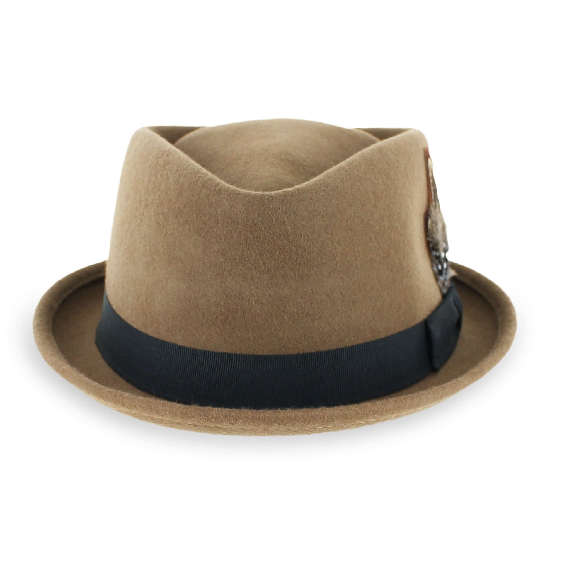 The Belfry Jazz is an affordable pork pie made of soft 100% wool felt that is both crushable and packable, making it a perfect travel companion. The Jazz's diamond crown is surrounded by a grosgrain ribbon hat band with a removable accent feather.