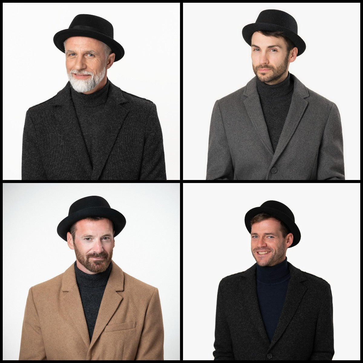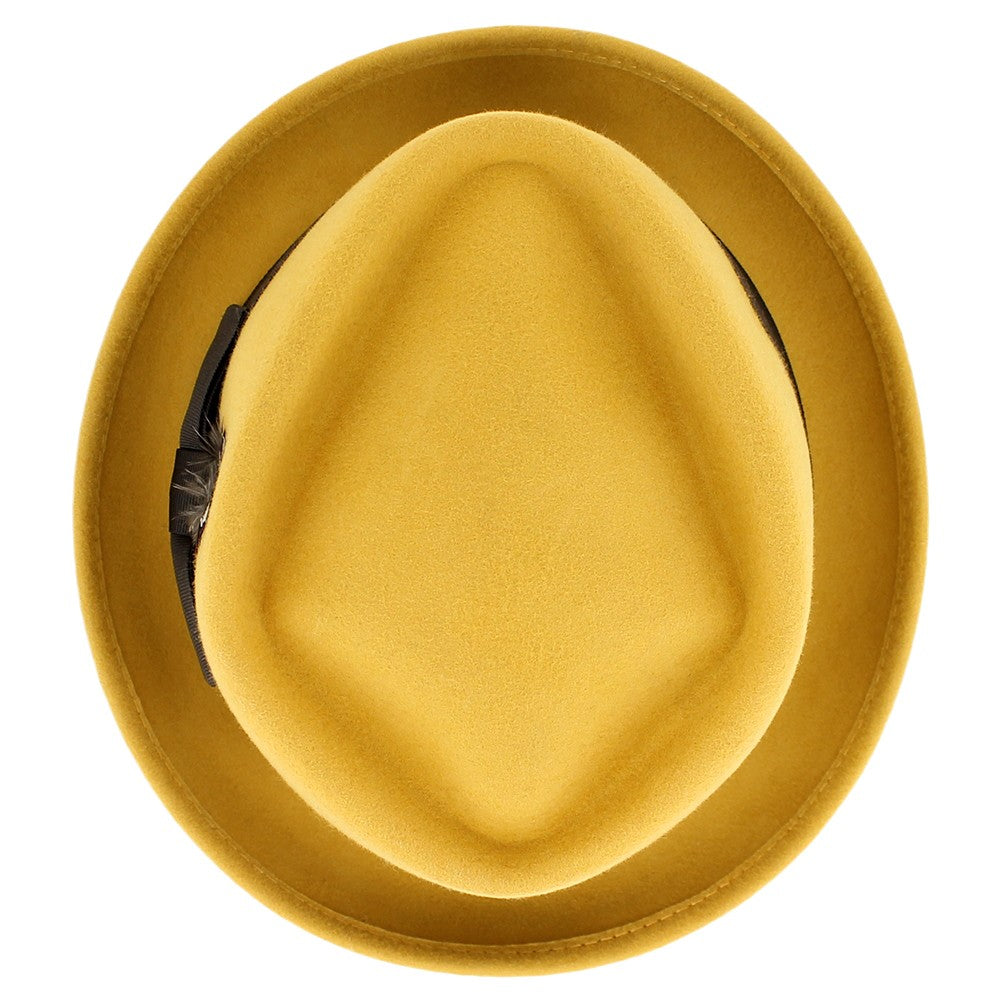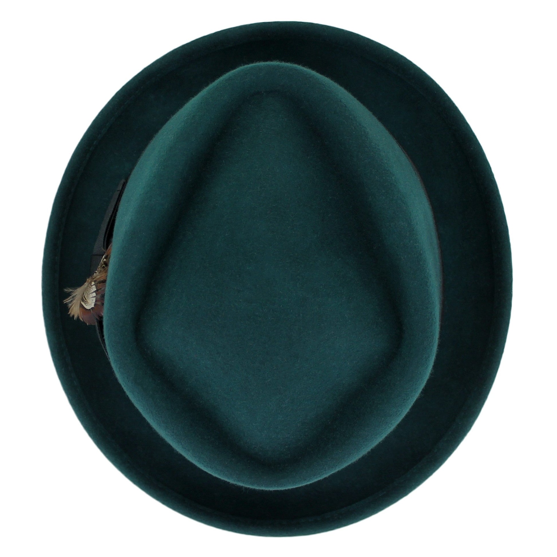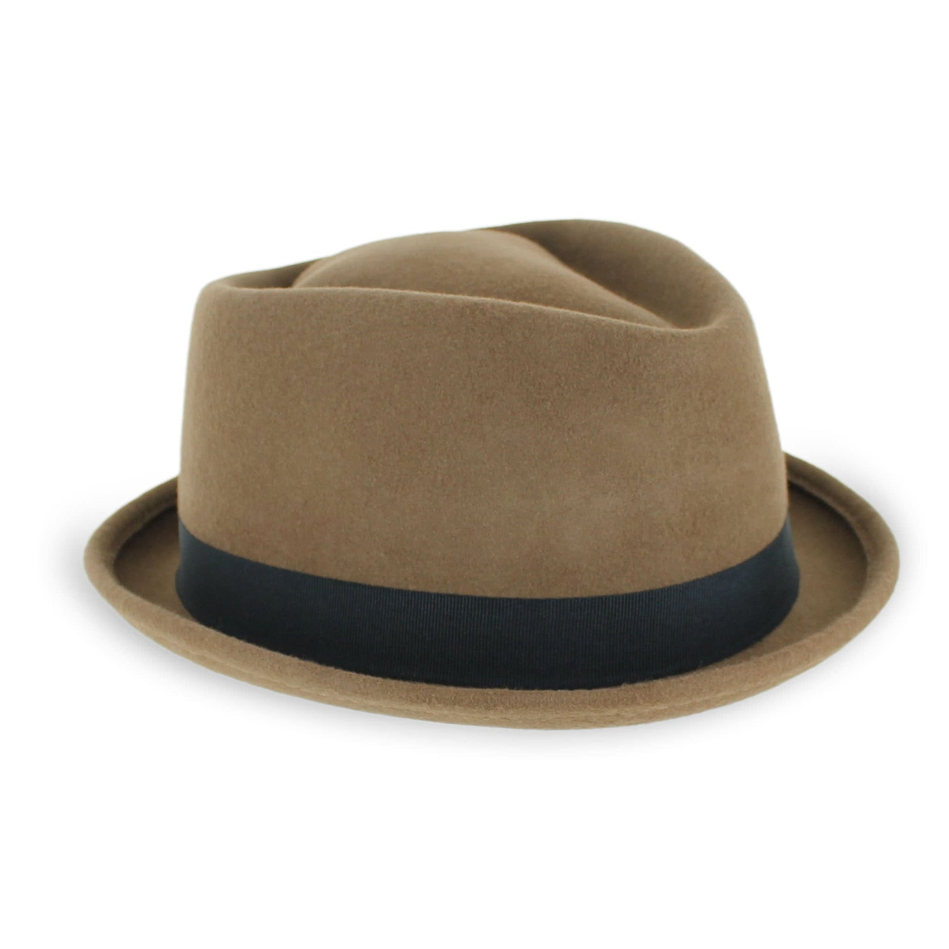 The Belfry Jazz is an affordable pork pie made of soft 100% wool felt that is both crushable and packable, making it a perfect travel companion. The Jazz's diamond crown is surrounded by a grosgrain ribbon hat band with a removable accent feather.